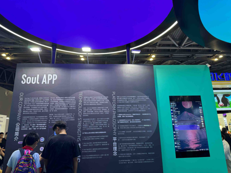 在Soul的展台上,他们展示出了通过多话、虚拟形象来满足感情需求的大模型,表示要让年轻人通过AI 建起一个“社交练习场”。现场还摆出几台手机,供AI对话体验,吸引了大量的年轻人。