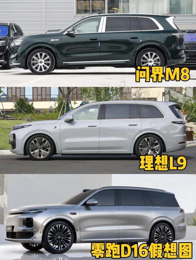 从车身的侧面来看,A柱-B柱、B柱-C柱、C柱-D柱几乎能够接近三均等分的比例设计,而在D柱的倾斜角度的选择,问界M8和理想L9选择呈现和45°,而零跑D16则选择尽可能和车身腰线垂直,从而整体线条更平稳,也能为留有更多的后备箱空间。这样的好处,可以解决三排乘坐的舒适性和可控可调范围,保证车内空间“平权”。