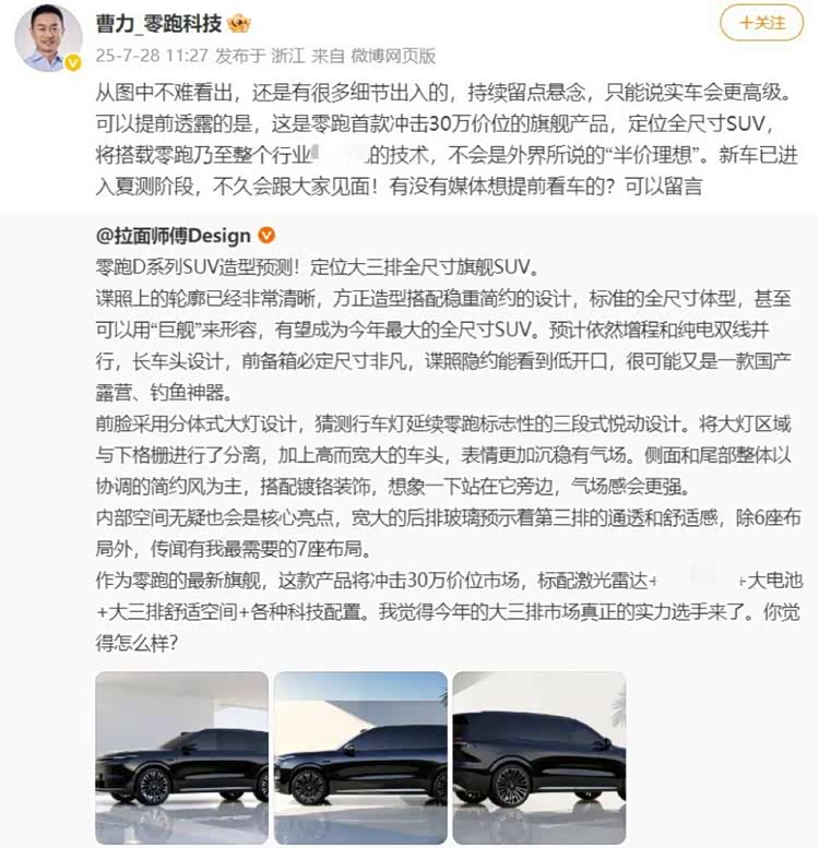 集所有科技于一身,零跑全尺寸旗舰SUV终于要来了!7月28日,零跑曹总透露了关于零跑旗下首款全尺寸旗舰 SUV 的更多信息,定价为30万级别。势必要一直打“亲民牌”的零跑,推出的全尺寸旗舰SUV依旧要定价30万级,那就说明这台车的重磅程度包括科技含金量将非同一般。