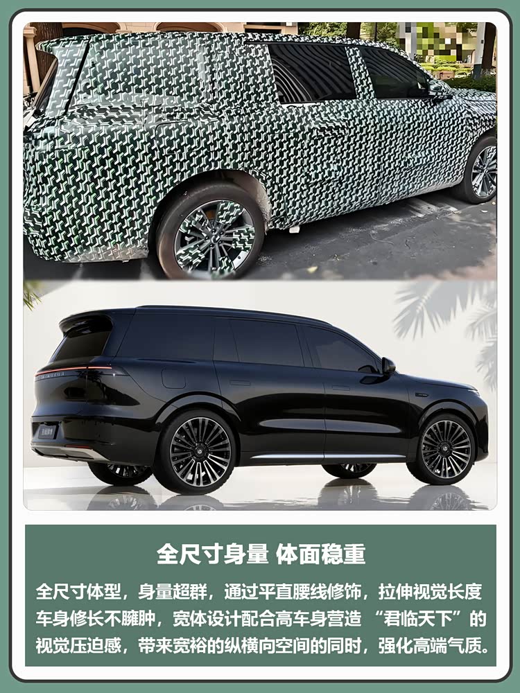 全尺寸体型,身量超群,通过平直腰线修饰,拉伸视觉长度,车身修长但不显臃肿,宽体设计配合高车身营造 “君临天下” 的视觉压迫感,为车内带来宽裕的纵横向空间的同时,进一步强化高端气质。