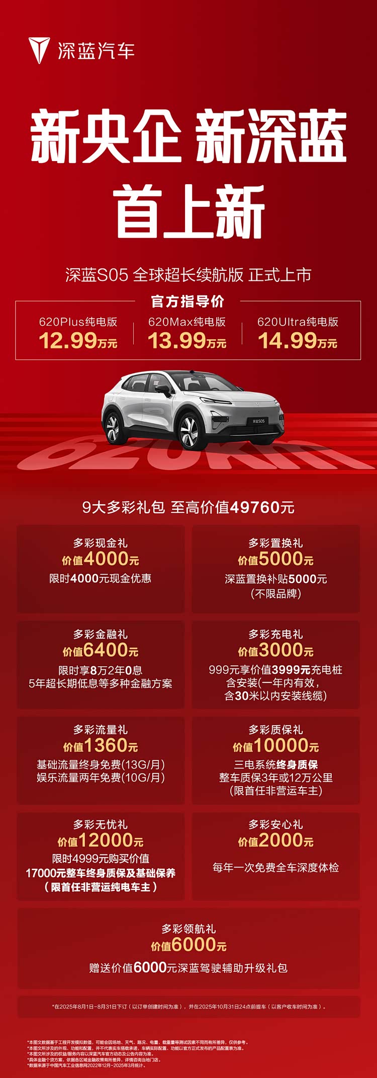 在用户关注的购车权益方面,8月31日前下订用户,可享至高价值49760元权益,包含4000元现金优惠、5000元深蓝置换补贴、2年0息或5年低息金融方案、三电系统终身质保、深蓝驾驶辅助升级礼包等。