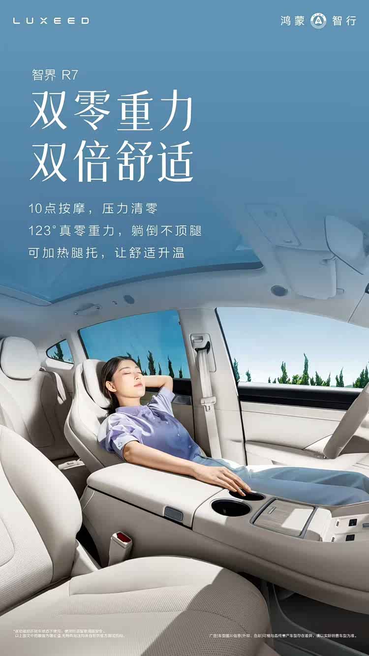 “双零重力,双倍舒享”,这可不是一句简单的口号。智界R7改款搭载了主副驾双零重力座椅,能够实现123°真零重力状态。当你坐进车内,只需轻轻按下按钮,座椅便会缓缓调整至最佳角度,仿佛置身于零重力的太空环境,全身的压力瞬间得到释放。而且,在躺倒的过程中,完全不会出现顶腿的情况,让你能够尽情舒展身体,享受这份惬意。