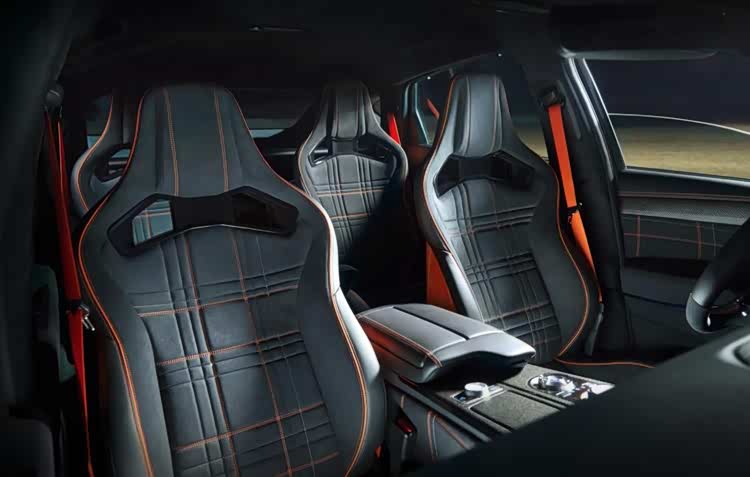 内饰设计延续外观的运动格调与高阶质感。座舱配备桶型运动座椅,拥有与车身同色椅背的桶形座椅,被NAPPA皮革与麂皮材质包裹,辅以双菱格缝线,采用Magma标志性的熔岩橙和钛灰配色,质感非凡。
