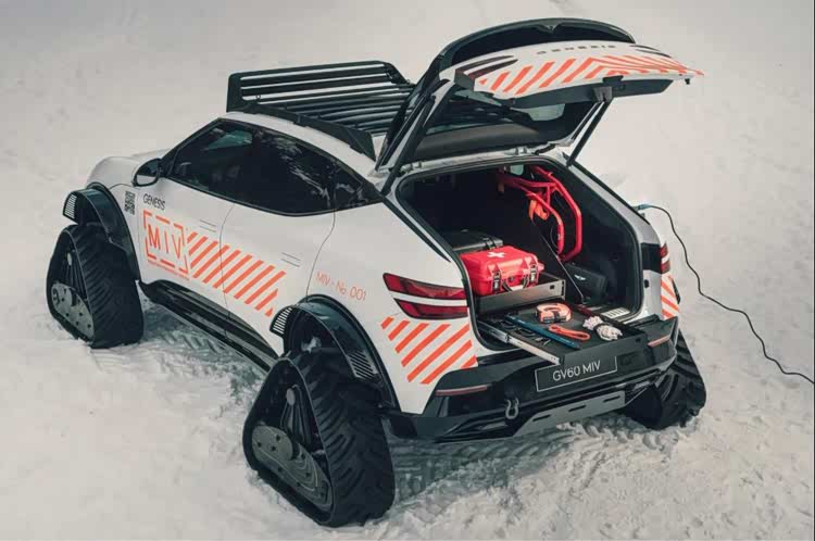 捷尼赛思GV60山地救援概念车将传统橡胶轮胎更换为雪地履带,并配备多项专业功能,包括运动型座椅、医疗用品、应急通信与预警系统等,可支持极端条件下的山地救援行动。大型碳纤维挡泥板可确保行人和车内人员的安全,同时保护车辆免受损坏。为提升承载与储物能力,车顶加装定制的重型行李架,后舱门行李架则配备了可安装各种设备的模块化连接点。此外,捷尼赛思GV60山地救援概念车还配备了车辆外放电系统,可为外部设备提供电力支持,在无基础设施的野外环境中极具实用价值。