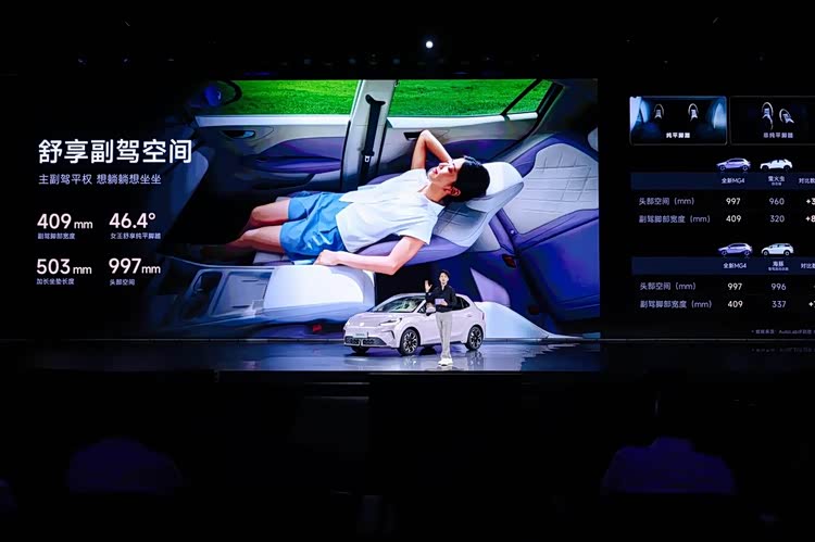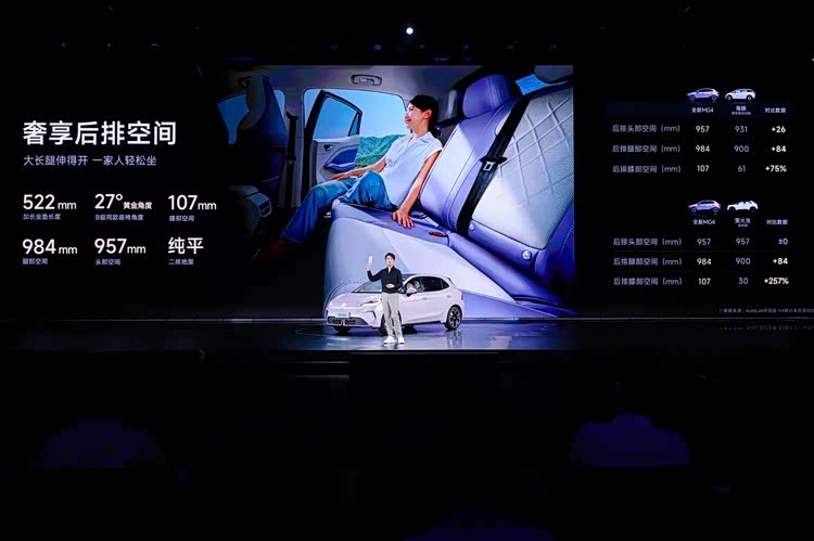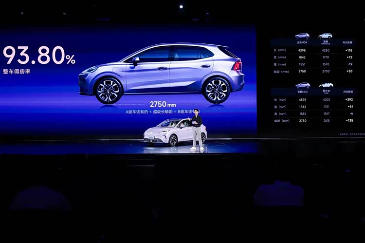 车身设计方面,全新MG4采用了四轮四边布局,最大化地拓展了车内空间,整车得房率高达93.8%。尽管车长不到4.4米,但轴距却达到了2750毫米,具体尺寸为长4395毫米、宽1842毫米、高1551毫米,相比旧款车型有了显著提升。