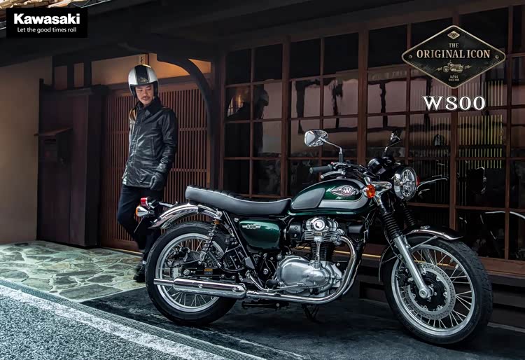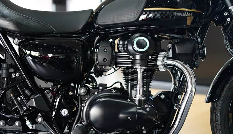 再来看排量稍微大一些的车型。川崎W800所搭载的是一款直列双缸风冷引擎,它压缩比8.4:1,最大功率35KW,最大扭矩62.9N·m。