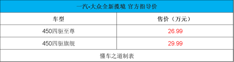 【懂车之道 产品】近日,懂车之道获悉,8月5日,一汽-大众全新揽境正式发布上市,推出2款车型,官方售价区间26.99-29.99万元。新车定位中大型SUV车型, 新车使用全新设计 ,在智能化变得更强,并搭载IQ.Pilot增强驾驶辅助系统,动力上搭载第五代EA888发动机。下面,和大家一起来看看新车的产品力如何?