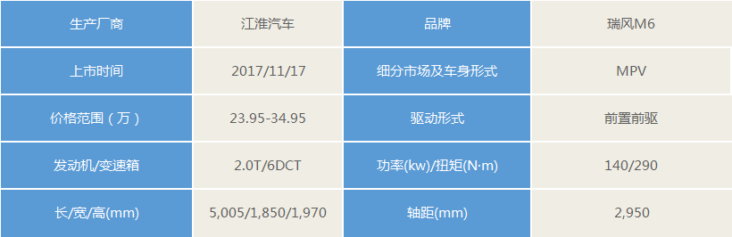 江淮今年的动作可以说相对算大的,除了上述的新能源方面,江淮今年在SUV和MPV均有布局。全新MPV瑞风M6的前脸非常个性,采用了江淮家族式宝瓶口中网,宽大细密的网状设计极具辨识度。侧滑门设计便于乘客上下车和货物装载的同时,也节约了横向空间。作为一款以商务出行为主的车型,瑞风M6在第二排配备了两个支持多向电动调节的独立式航空座椅、后排显示屏、小桌板、脚托、220V电源、两侧均采用银色玻璃等配置。在各大车企家用MPV今年集体遭遇滑铁卢时,江淮看准时机,找到了MPV市场中的增长点——商用MPV下手。