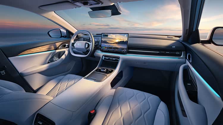 内饰采用环抱式布局,提供三种西湖印象主题配色。中控区域搭载15.4英寸悬浮屏幕与12.3英寸仪表盘,支持选装16.6英寸W-HUD。银河NOS智能系统具备四区语音交互与多端互联功能。全系配备"棉花糖"皮质座椅,高配车型支持14点按摩及通风加热,后排座椅支持比例放倒,后备厢容积可扩展至988L。
