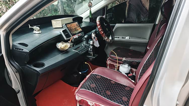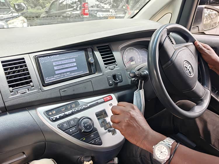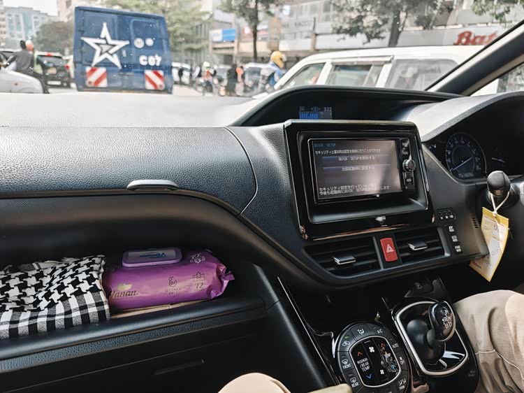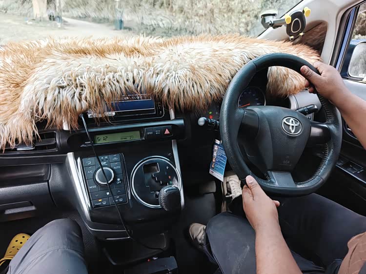 丰田Wish的车身尺寸并不大,4.6米左右,轴距也就是2750mm,更像是卡罗拉的旅行版。内饰基本都是硬塑料件,中控屏同样是日文操作界面,肯尼亚的日本车基本上都是二手车、三手车卖到肯尼亚,而且这个中控屏可能是后装的。不过司机还贴心的用了动物毛皮把前IP上盖住,避免高温直射。