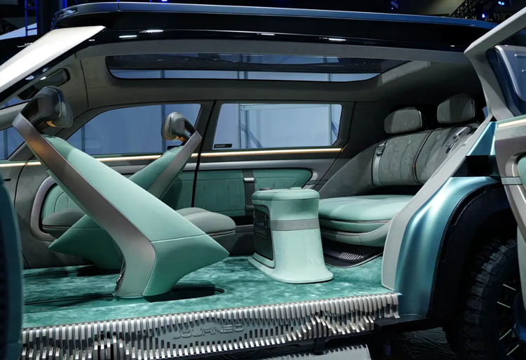 它的“疯狂”不止于外观:前排座椅能360度旋转,和二排形成“面对面会议室”;搭载的AI系统能通过穿戴设备监测乘员心率、呼吸,甚至根据情绪调节空调和音乐——这已经不是“车”,更像“会移动的智能舱”。
