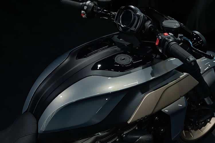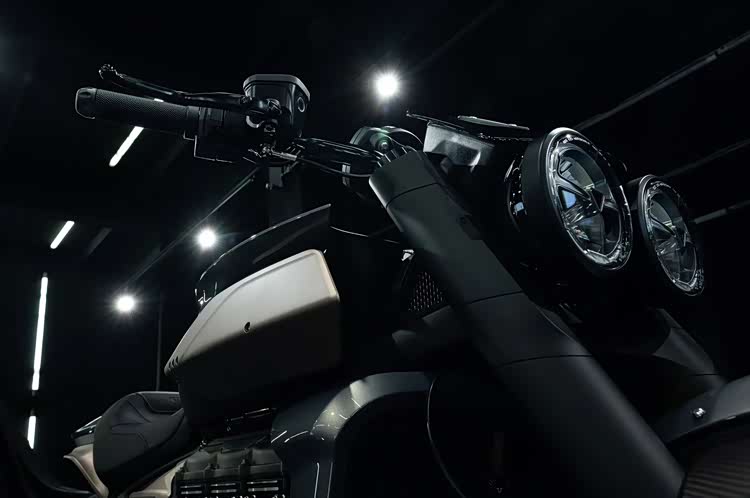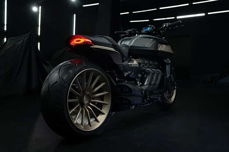 动力部分依旧保留原厂那颗 2,458c.c. 直列三缸引擎,180 匹马力、275Nm 的暴力输出照旧上身,不动引擎就已经够狠。 底盘改造才是重头戏——自行设计加长的悬臂式摇臂结构让后轮加宽到惊人的280mm,前后轮圈同步升级为18寸,比例瞬间更霸气。 三角台与前叉护盖也重新设计到宛如精品,细节更衬托Rocket 3经典的双圆头灯。