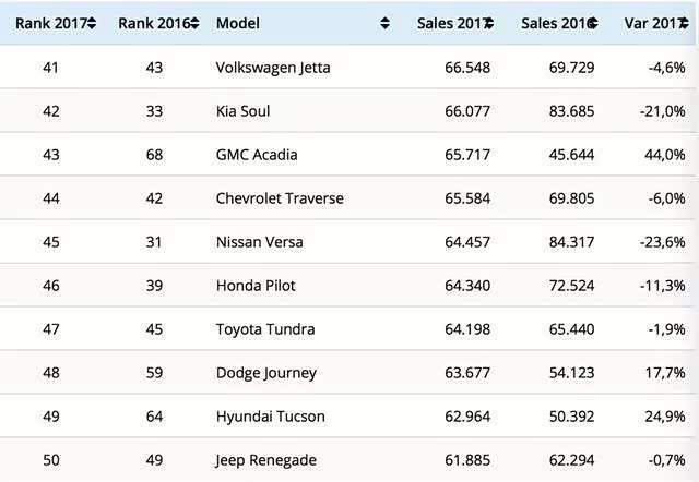 更惨的是,在美国2017年汽车销量榜前五十车型中,大众旗下的只有一台,而且仅仅排在41名。