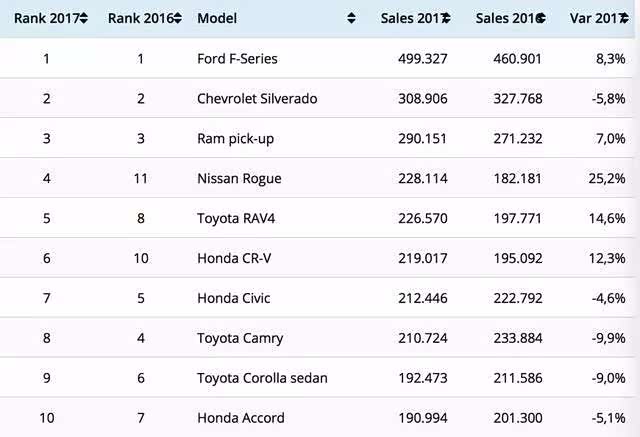 还是以数据说话,2017年美国汽车销量排行前十的车型都有啥特点,根据我这个脑子还算过得去的人的精密仔细分析:除了前三万年不变的皮卡霸主地位,全都是日系车。