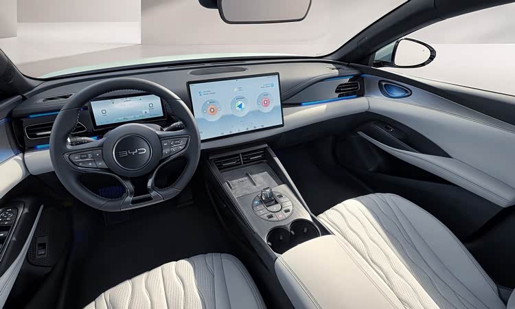 内饰细节配置方面,采用了比亚迪的"海洋美学"理念,配色提供海韵灰和曜夜黑两种选择。布局采用"双悬浮式"设计,中控台配备15.6英寸悬浮式中控屏,采用怀挡式电子换挡设计,扶手区域设计简洁,配备50W手机无线快充和冷暖两用车载冰箱。