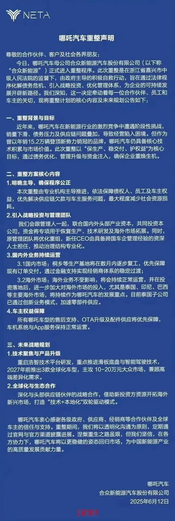 但危机之中,总有曙光初现。今年6月,合众新能源启动破产重整程序,公开征集重整投资人,设定了注册资本、资产规模及产业资源等严格门槛,显示出恢复元气的决心和标准。市场反应积极,截至8月已有数十名意向投资者报名参与。与此同时,工厂开始清理设备、调试产线,部分员工已返岗,销售网络逐步联络中。管理层也进行了人事调整,力图通过优化团队迎接挑战。