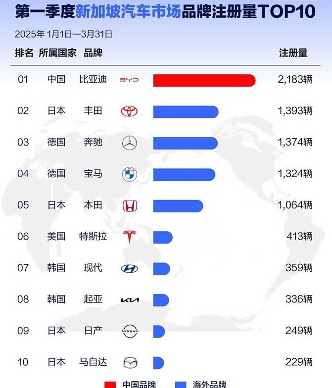 2025年1-3月,新加坡汽车市场品牌注册量第1名是比亚迪,注册量达到2183辆。