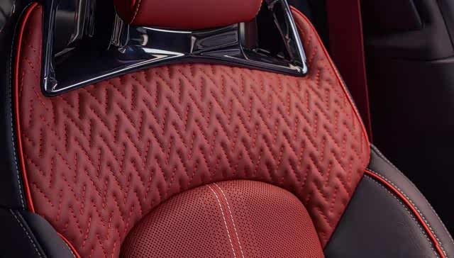 进入车内,内饰采用全新黑红双色搭配,座椅靠背区域增加全新 V 字形缝线,展现出独特的设计风格。车内大面积采用真皮材质和翻毛皮材质交替铺陈,触感柔软且舒适,同时还加入了带有红色交织状纹理的碳纤维装饰面板,将性能车的浓郁氛围烘托得淋漓尽致。此次内饰最大的革新,当属 33 英寸的 9K 环幕式曲面屏,仪表盘与中控屏连为一体,显示效果清晰细腻,为驾驶者提供了丰富的车辆信息和便捷的操作界面。