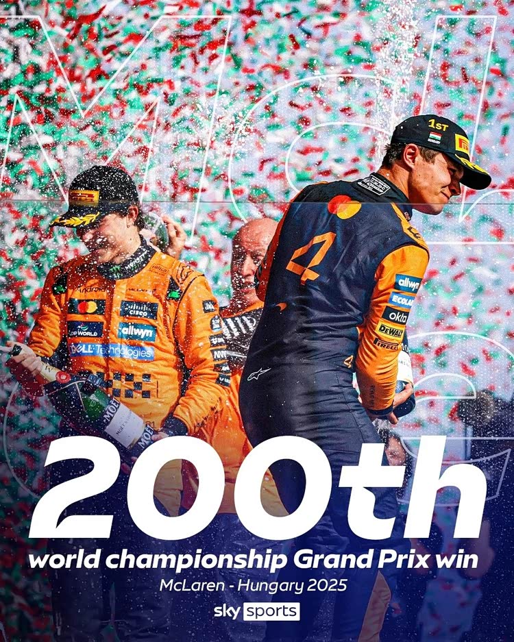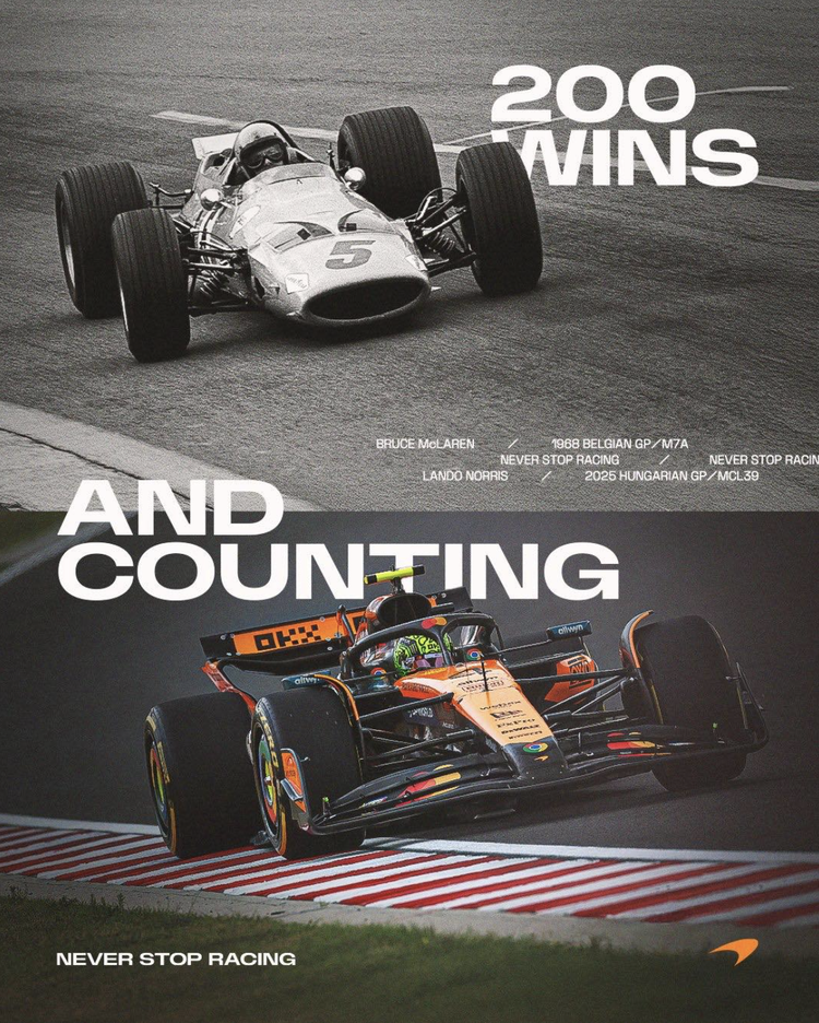 F1 2025赛季匈牙利分站赛,迈凯伦车队自1988年以来又一次连续四站夺得冠亚军,与此同时,截止本站已在本年度中七次以冠亚军收割比赛,奥斯卡·皮亚斯特里也成为F1历史上连续完赛时间第三长的车手,最终也成就了迈凯伦车队的第200场分站赛冠军,迈凯伦在顶尖汽车运动中的统治力一览无余。