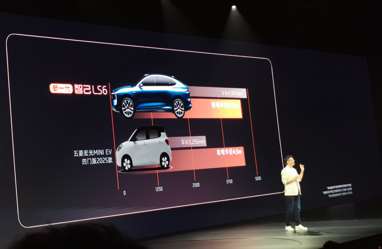 官方拿新车和车长为3256mm的五菱宏光MINI EV做了对比。数据显示,后者转弯半径为4.5m,而前者即车长为4937mm的智己LS6的转弯半径为4.79m。