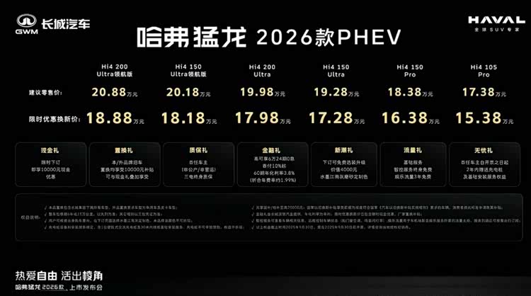 2026款哈弗猛龙通过外观、智驾、动力以及纯电续航的升级,实现了产品力的全方位进阶。它不仅传承了方盒子硬派基因与Hi4电四驱的技术优势,更在智能化与纯电续航层面补齐短板,大幅提升了在新能源泛越野市场的综合竞争力。再加上15.38万元起的诚意售价,这款焕新升级的“方盒子”无疑为追求个性、智能与全能体验的消费者提供了更具吸引力的选择。