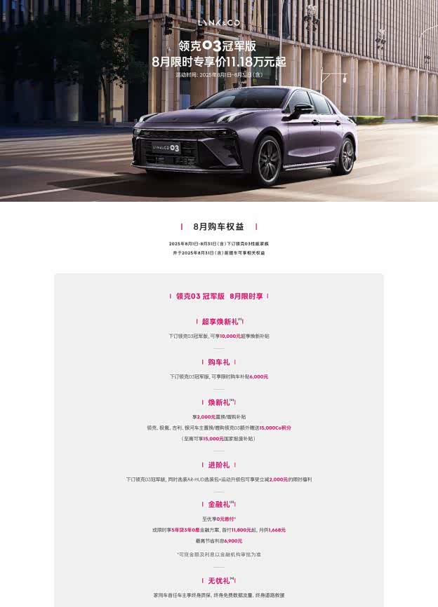 领克03家族在八月推出多项购车政策,以真金白银降低性能车准入门槛。领克03冠军版限时专享价11.18万元起,旧车置换或增购可享2000元补贴;领克、极氪、吉利、银河老车主置换或增购,额外获得15000Co积分。03+和03++车型则提供性能进阶基金、高能颜值礼、赛道体验礼等专属权益,覆盖从购车到用车全周期,减轻消费者经济压力。