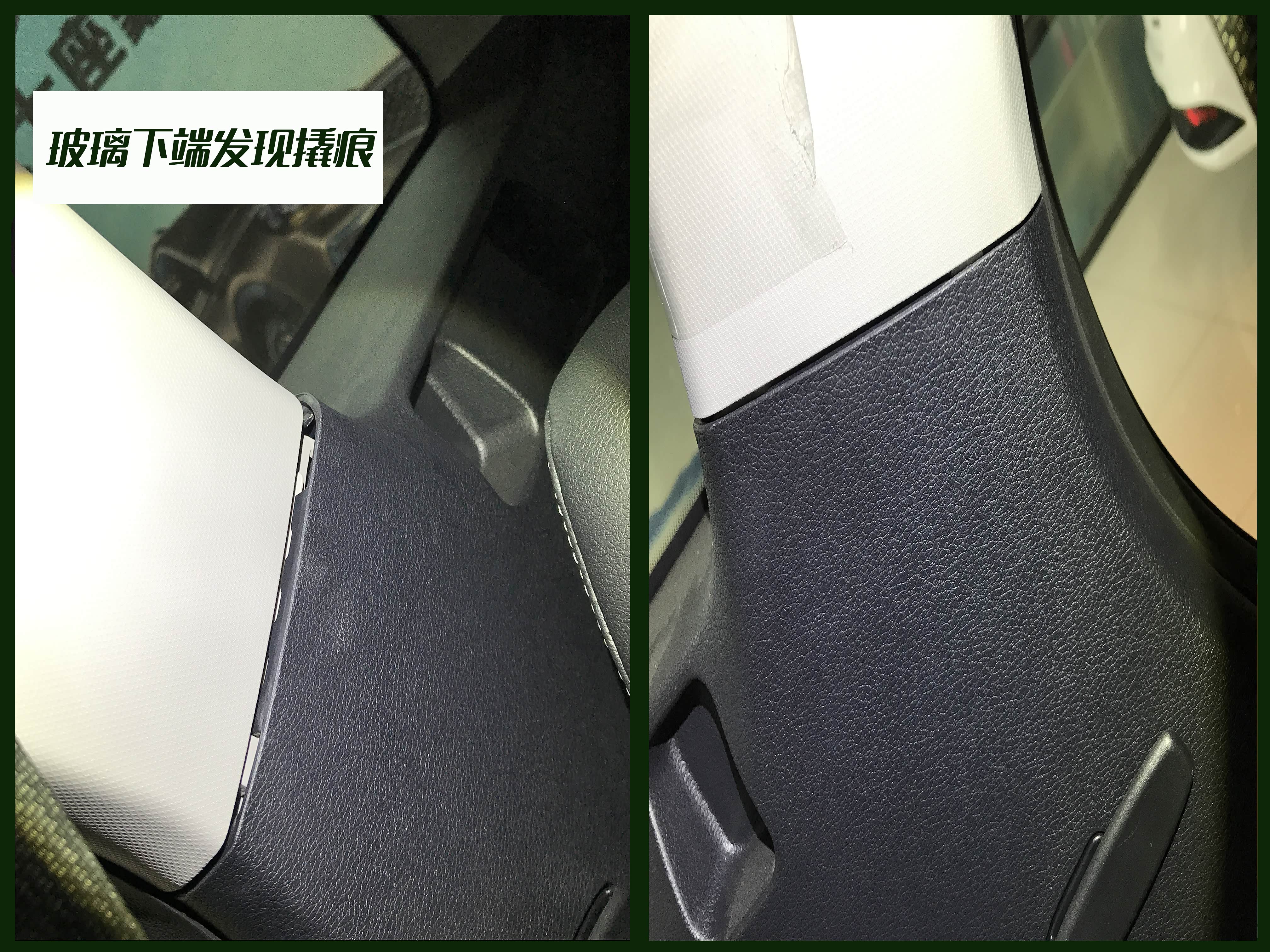 在后排小窗位置,玻璃与盖板连接部位有较多磨损,我判断是拆装内饰盖板造成,并且我对比了另一侧的相同位置,没有相同的情况,可以排除是原厂装配工艺造成,属于后期修复。
