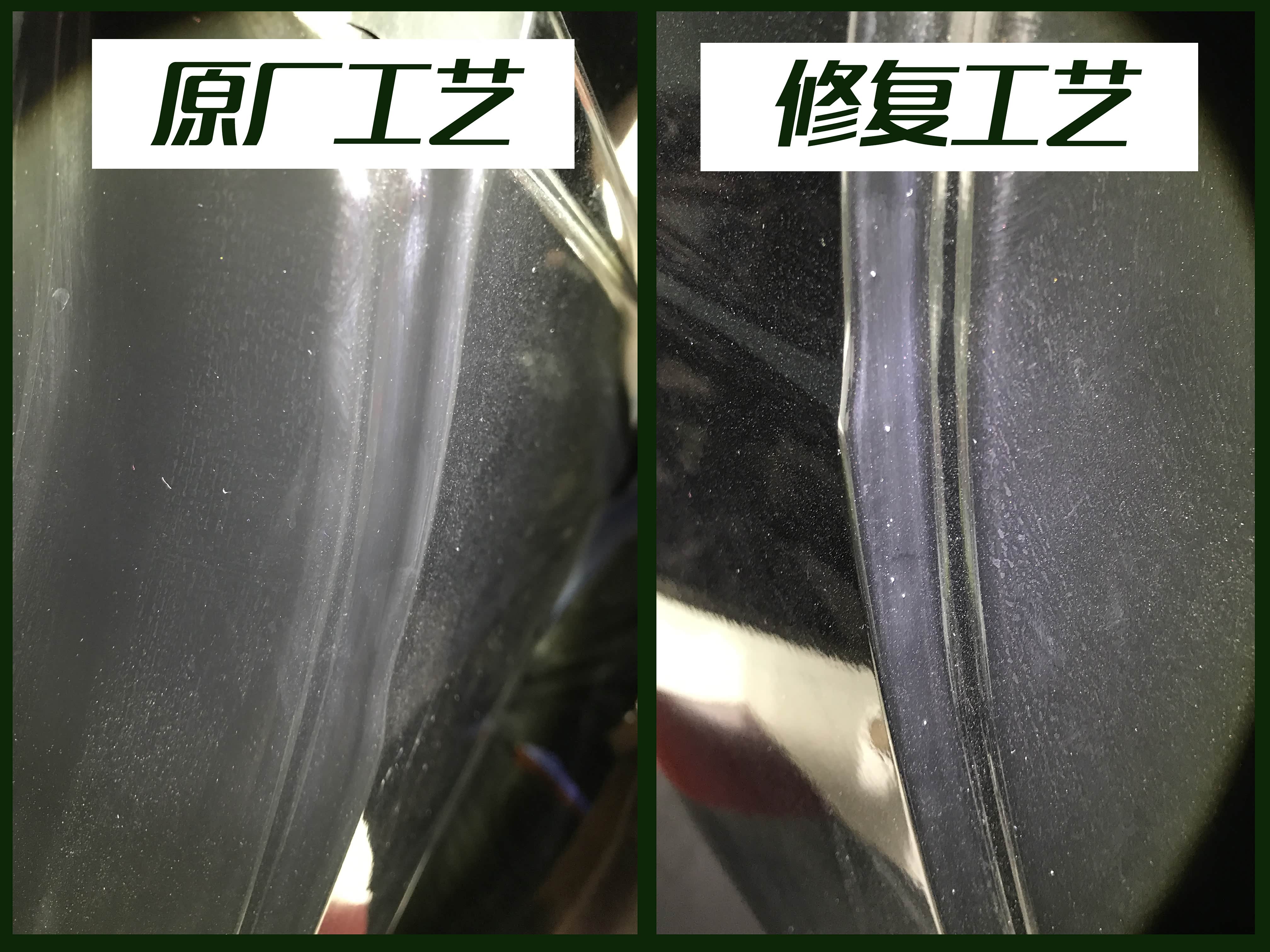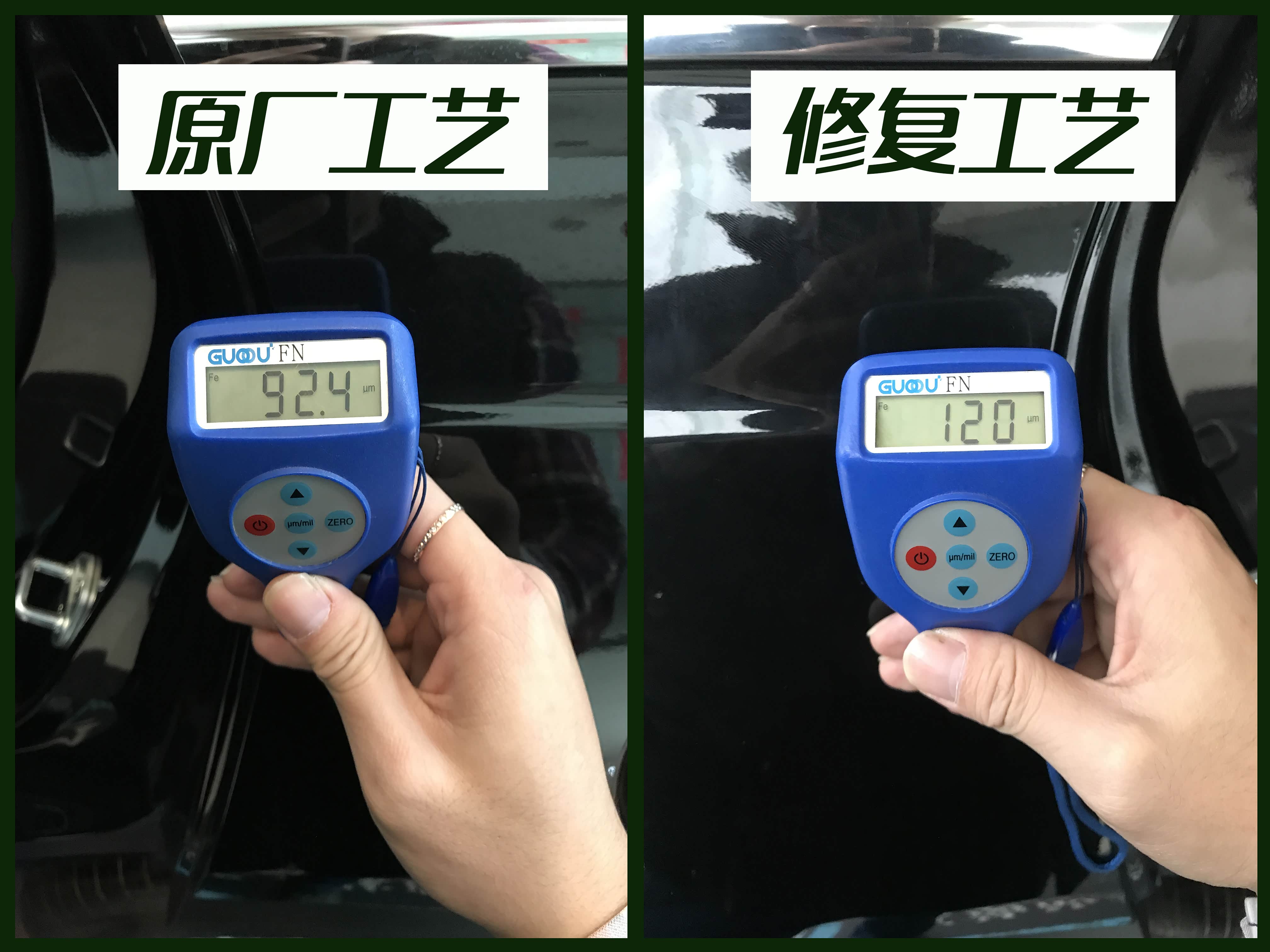 图上的原厂工艺,是左后门门框相同位置,漆面平滑无橘皮,修复工艺是右后门门框,修复面橘皮纹非常明显,并且有喷漆时气泡残留产生的磨砂手感,为了让客户更好的理解修复工艺与原厂工艺有何不同,我拿出了漆膜仪。