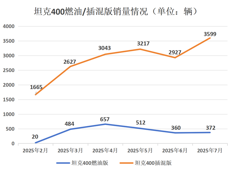 坦克400(参数|询价)最初只推出了插混版本,但很多人呼吁官方新增燃油版,为了响应大家的号召,今年2月坦克400汽油版正式上市。可新车诞生至今月销量最高只有657台,今年7月只卖出372辆,反观插混版坦克400销量是3599辆,两个版本的销量差距接近10倍。