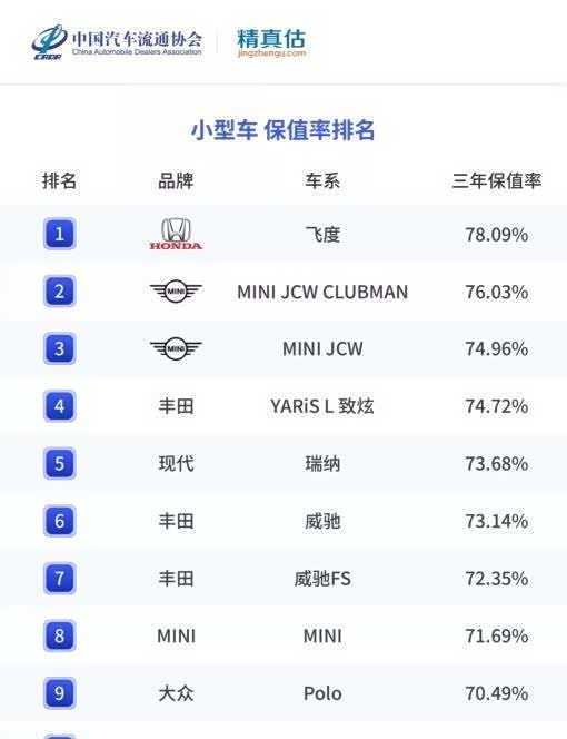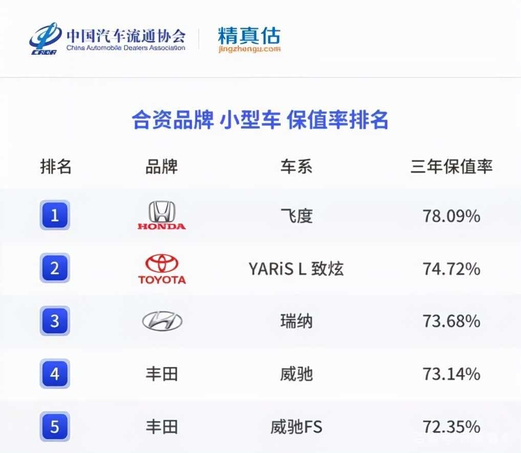 合资品牌小型车前五名,除了北京现代瑞纳之外,其余均是日系车型。看看飞度,高达78.09%(三年保值率),领先不少,是真的能打呀。
