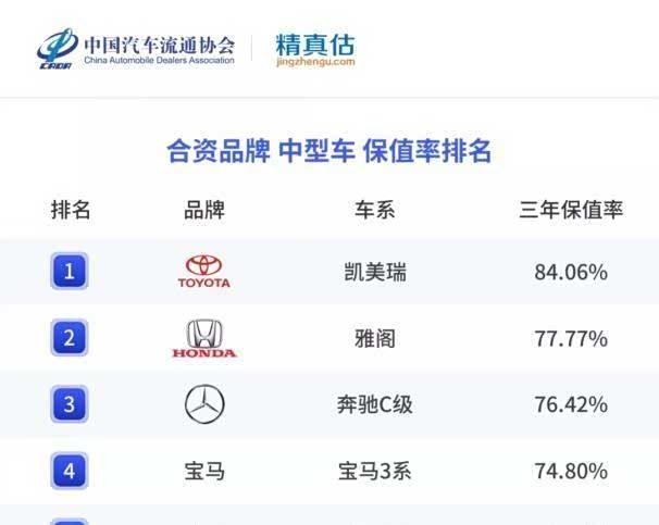 光看合资车型,凯美瑞、雅阁、北京奔驰C级的保值率均高于75%,分列前三。华晨宝马3系和东风本田英仕派,则排在第4、5名。