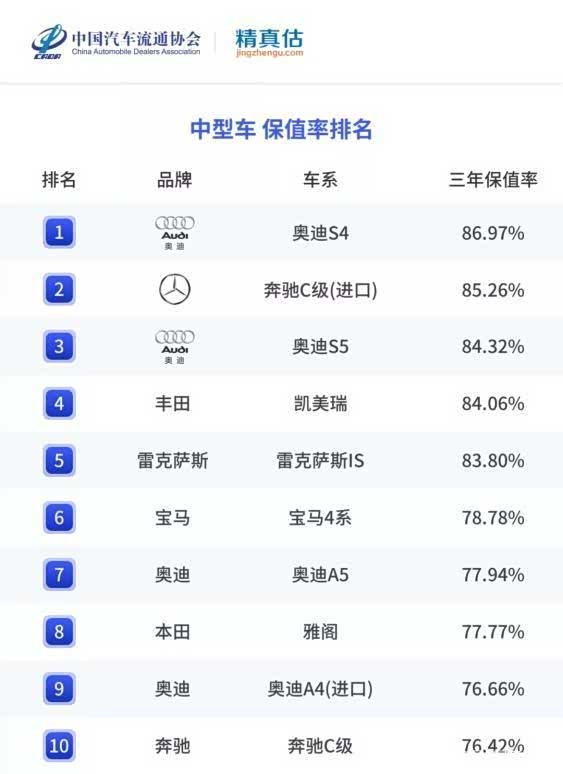 中型车方面同样是进口车型占了一大半,德系豪华品牌排名比较靠前,前三名分别是奥迪S4、奔驰C级(进口)、奥迪S5,前五名的车型保值率均高于80%。日系方面,前十仅有广汽丰田凯美瑞和广汽本田雅阁两款车型在榜。
