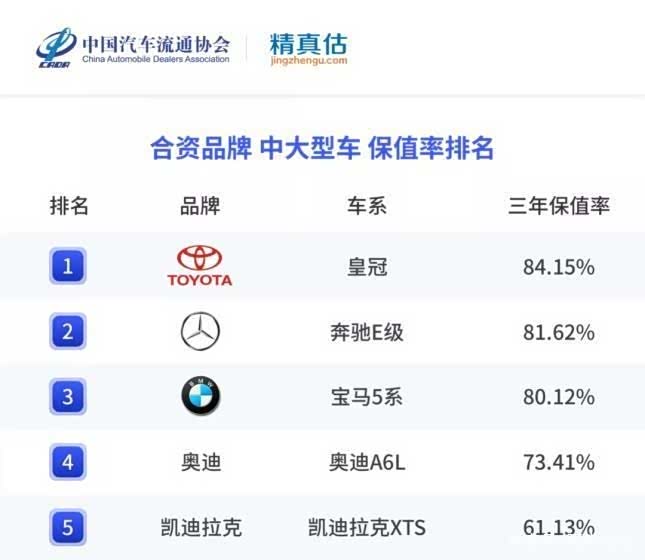 合资品牌方面,一汽丰田皇冠、北京奔驰E级、华晨宝马5系的保值率均在80%以上。