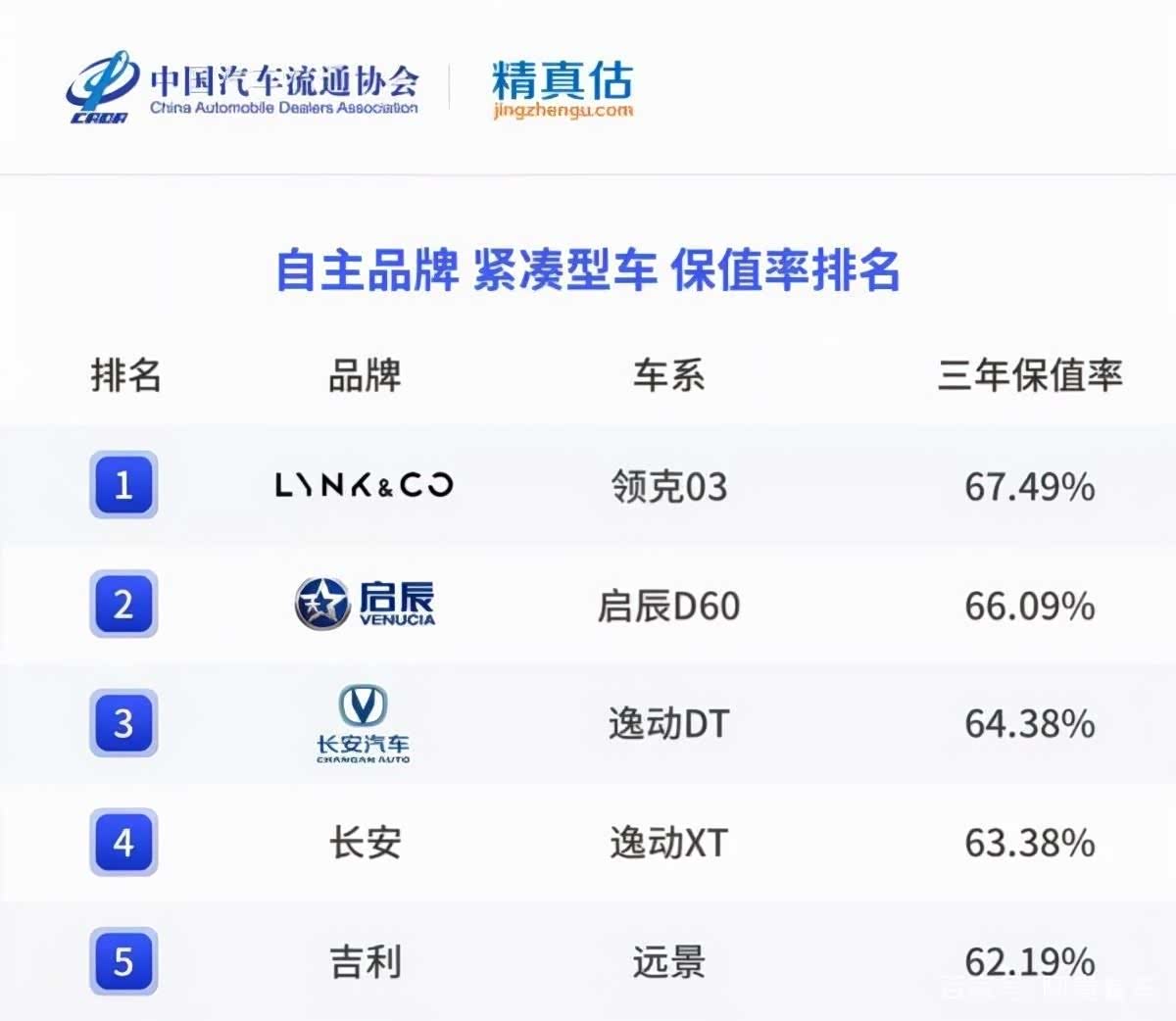 自主品牌方面,领克03以67.49%的三年保值率位居第一,大家对于领克品牌的认可度还是比较高的;而继承日产基因的启辰D60位居第二,这两款车型三年保值率在65%以上。