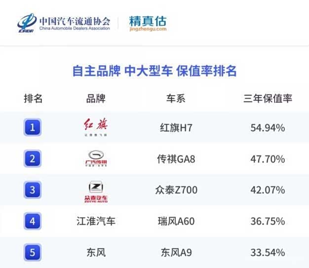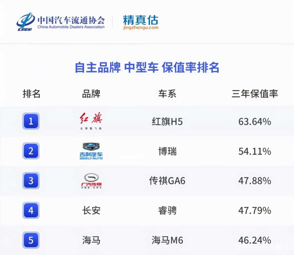 而自主品牌在中型车领域市场占有率本就不高,保值率方面也欠佳,仅有红旗H5一款车型保值率高于60%。