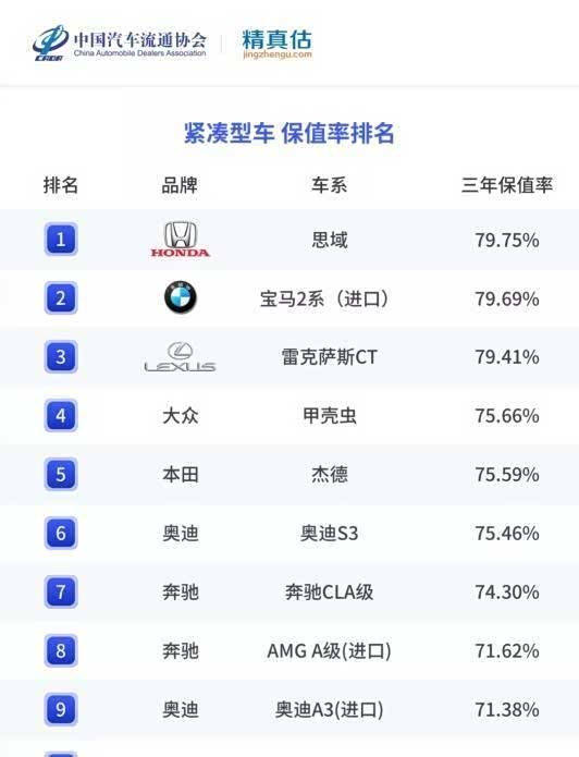 紧凑型车作为轿车中最为走量的车型,保值率前十榜单中依然是合资车与进口车的天下。思域以79.75%的三年保值率,位居第一。而后大部分是高端品牌进口车型,比如宝马2系(进口)、雷克萨斯CT的保值率也在79%以上;还有奥迪S3、奔驰CLA、奔驰AMG A级(进口)、奥迪A3(进口)等车型。而像大众甲壳虫这样的经典车型,保值率也高于75%。
