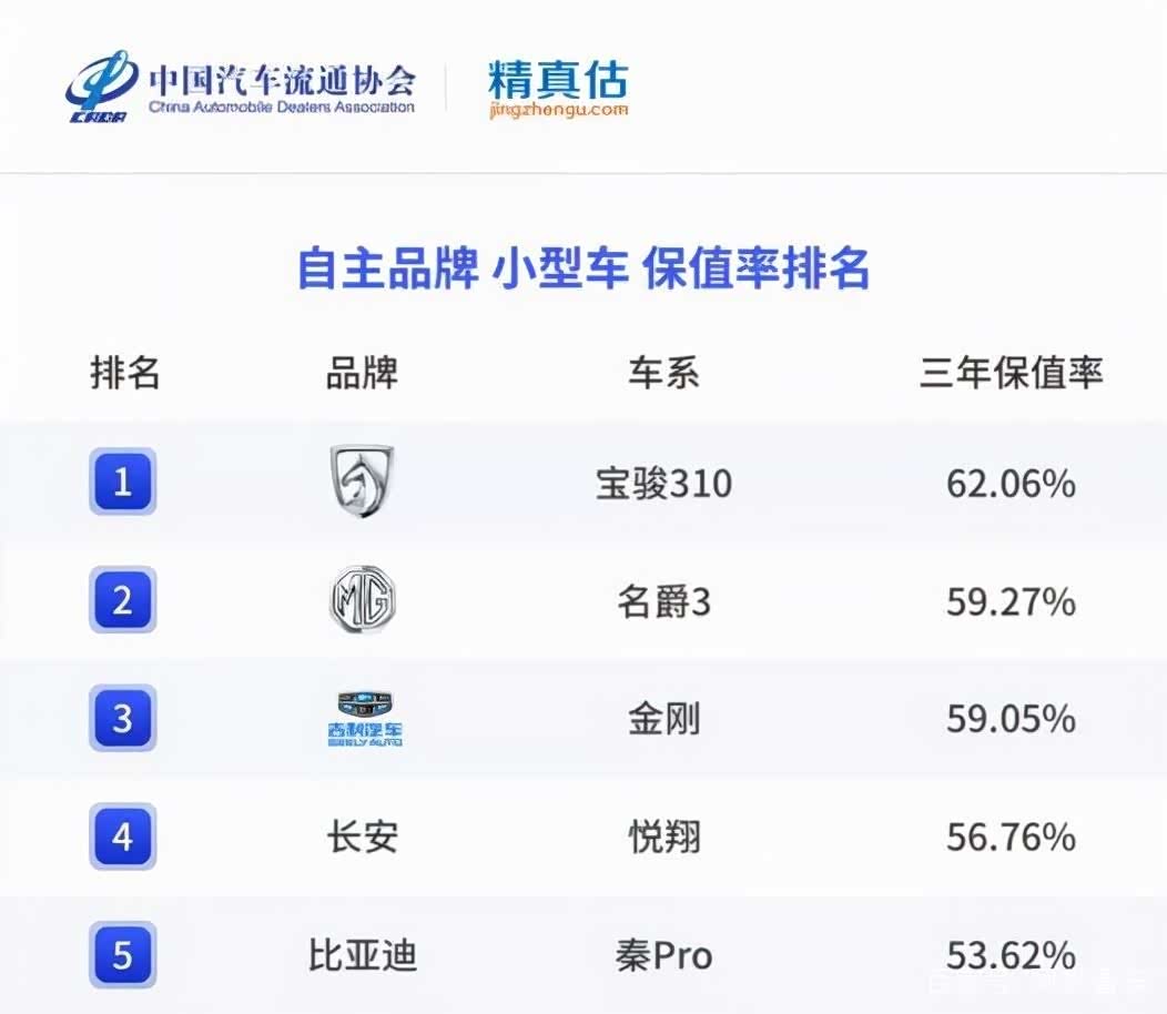 自主品牌小型车方面的表现则一般,排在第一的宝骏310的保值率也仅为62.06%,其余车型均未达到60%。