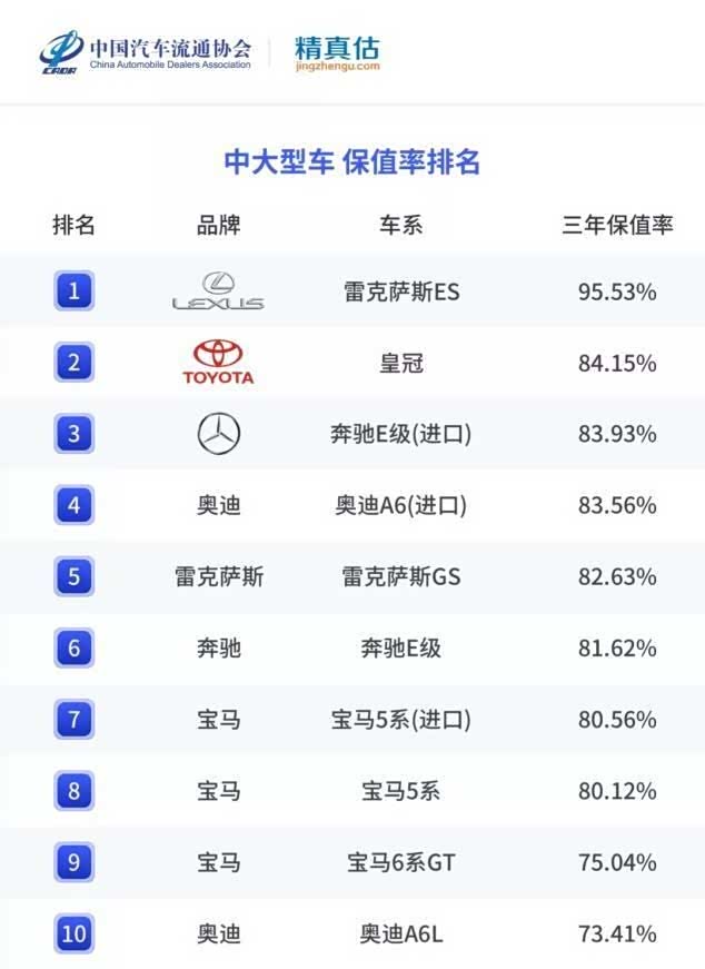 中大型轿车排名前十车型的保值率普遍偏高,有8款车型高于80%。其中,雷克萨斯ES的保值率就离谱,高达95.53%。不过这与其长期加价销售的方式有关,也是品牌溢价的表现。