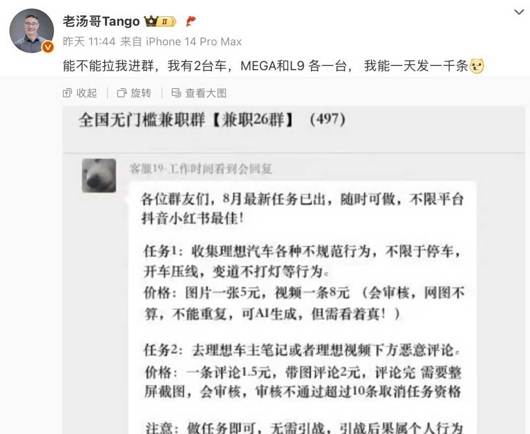 8月6日,一个名为“黑理想兼职群”的聊天截图突然在网上疯传。 群内明码标价:拍摄理想汽车“不规范行为”视频(如乱停车、压线变道)一条8元,在车主笔记下刷恶意评论1.5元/条,带图评论涨到2元。 更讽刺的是,理想汽车产品负责人汤靖直接调侃:“能不能拉我进群? 我有两台理想,一天能发一千条! ”