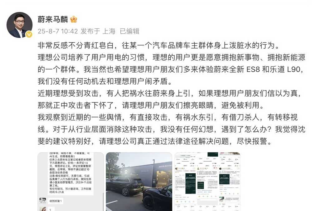 理想发声后,网友迅速将矛头指向蔚来。 蔚来高管马麟连夜回应:“祸水引向蔚来,正中攻击者下怀! ”他建议理想“尽快报警”,并强调蔚来车主也在遭遇类似困扰。