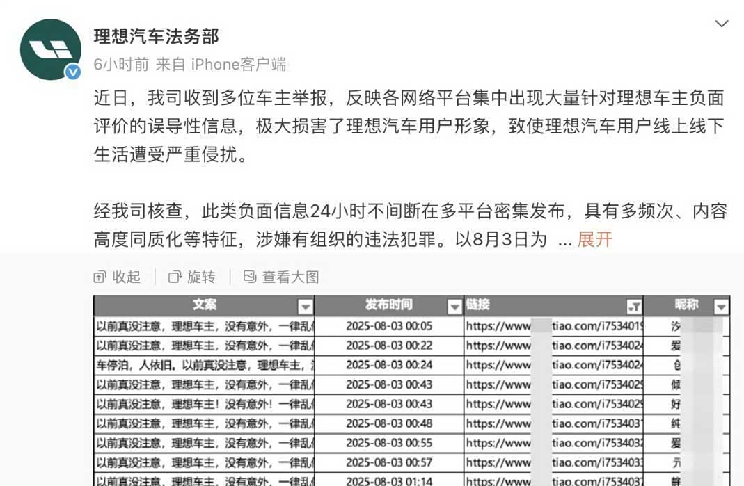 24小时后,理想汽车法务部发出公告:这些负面信息在多平台24小时不间断发布,内容高度同质化,已构成“有组织的违法犯罪”。 他们正在固定证据,准备通过民事诉讼、刑事报案等途径追责。