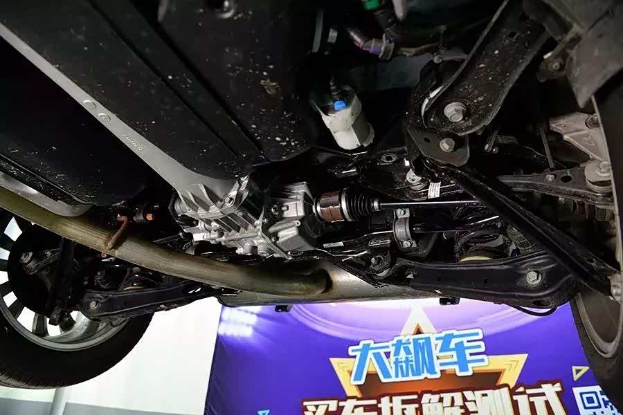 凯迪拉克XT5的底盘从这个角度看,简直是惨不忍睹,没有任何的护板!没有发动机下护板,也没有两侧护板,显得乱糟糟的一片。一台豪华品牌车型,竟然没有护板,也真是醉了!四、五十万的车,还吝惜几块塑料板么?