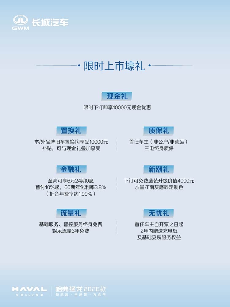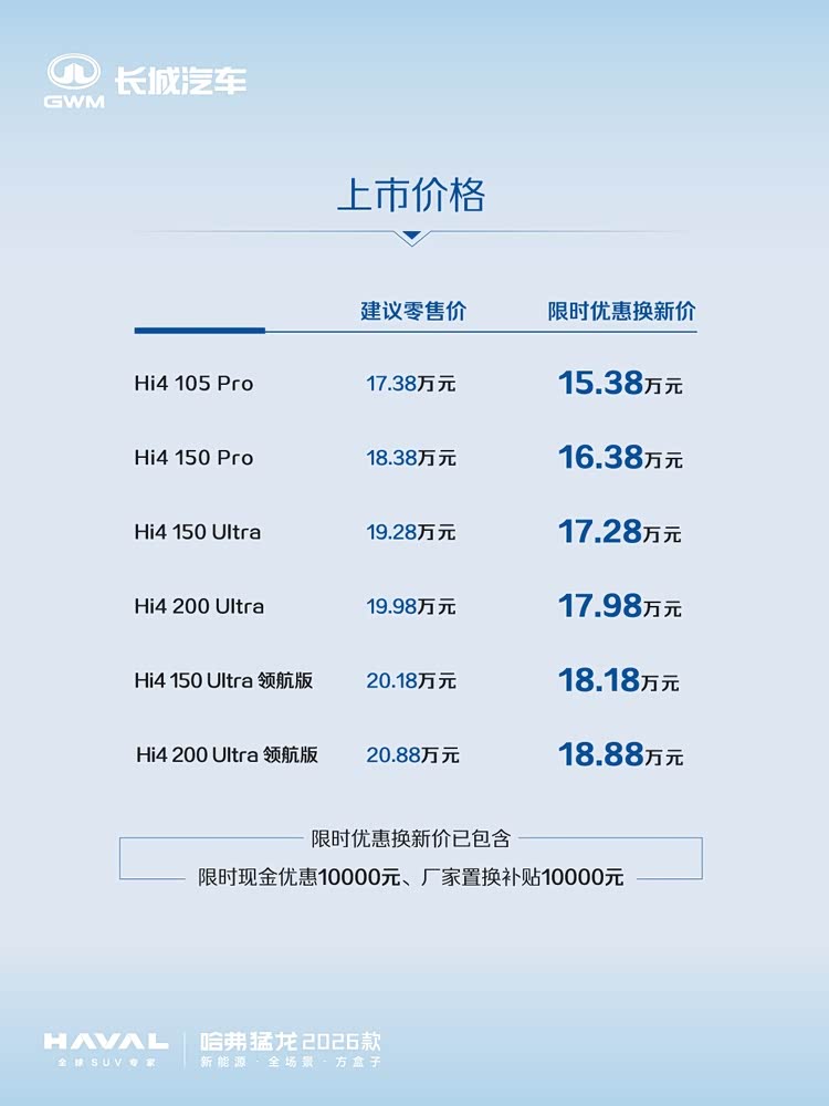 前一阵我去到草原试驾了 哈弗猛龙(参数|询价)2026款跟大家分享了试驾体验,这回他的价格终于来了!新车共推出6款车型,建议零售价17.38万元-20.88万元。即日起至9.30购车,可享现金礼10000元 ,置换礼10000元(可与现金礼叠加),限时优惠换新价15.38-18.88万元。另享金融礼、新潮礼、流量礼、无忧礼等限时壕礼。
