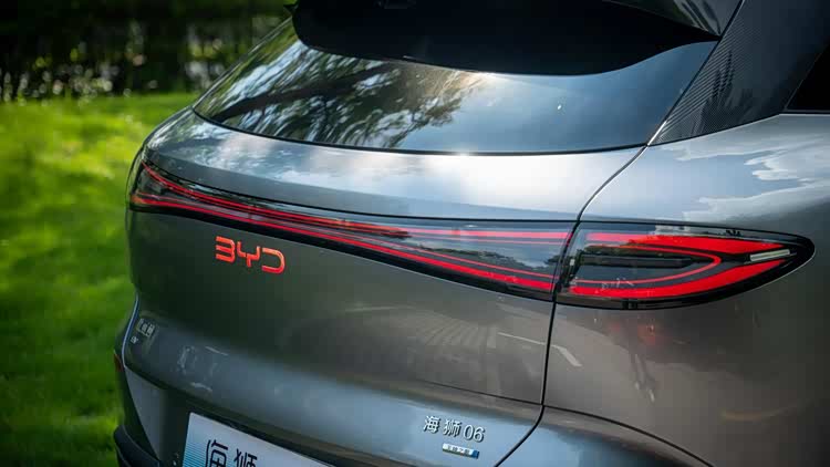 车尾的设计同样令人印象深刻。贯穿式的 LED 尾灯是海狮 06EV 的一大亮点,灯带纤细而连贯,在夜晚点亮时呈现出均匀而柔和的光芒,宛如一条璀璨的光带,极大地提升了整车的辨识度。尾灯下方的线条设计与车头相呼应,形成了前后协调的整体感。