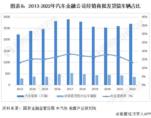 根据国家金融监管总局和中汽协的数据,2013-2022年十年间我国汽车金融批发渗透率总体变化不大。2022年汽车金融公司全年累计发放的经销商批发贷款车辆363.48万辆(对应新发放批发贷款7994.99亿元),占2022年我国汽车销量的13.43%,持续助力我国汽车产业发展。