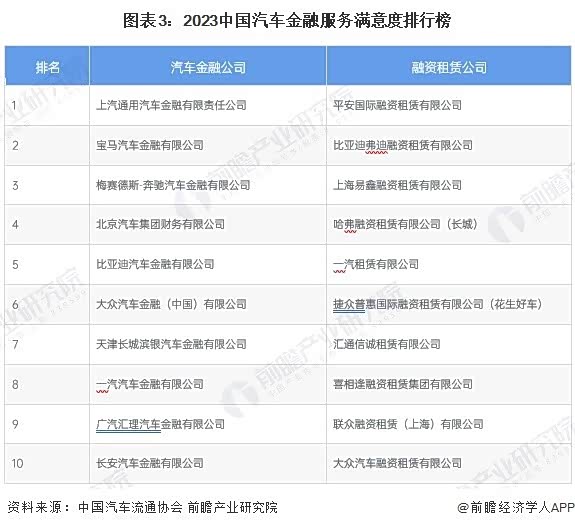“2023中国汽车金融服务满意度排行榜”是由中国汽车流通协会汽车金融分会、中国汽车流通协会云数聚平台等机构共同发起、面向全国汽车消费者的满意度调研活动,评选覆盖银行、汽车金融公司、融资租赁公司、保险及延保公司等5大模块。根据榜单,2023年上汽通用汽车金融有限责任公司和平安国际融资租赁有限公司的汽车金融服务满意度分别位列汽车金融公司和融资租赁公司榜首。