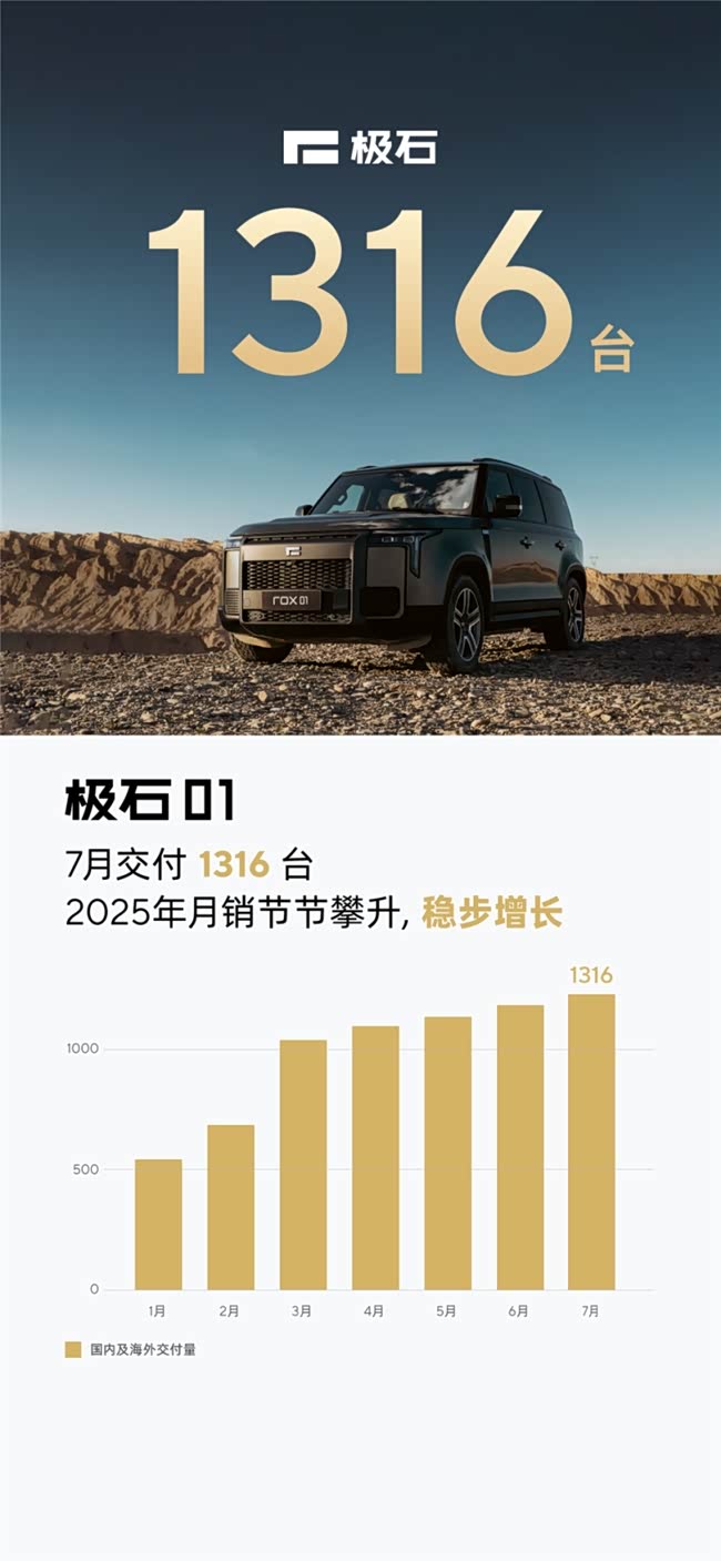 在国内市场,极石 01 销量呈稳步上升趋势。2025 年 7 月,极石 01 销量达到 1316 辆,环比增长 4.53%,连续多月保持销量增长。从 3 月交付 1056 辆,到 4 月交付 1128 辆,再到 5 月交付 1236 辆,6月交付1259台,单月交付量持续创新高,累计销量在竞争激烈的 SUV 市场中也占据了一席之地。出色的市场表现,不仅体现出消费者对极石 01 产品力的认可,更彰显了极石品牌在国内市场的影响力正逐步扩大。许多消费者被极石 01 硬派大气的外观所吸引,其线条硬朗,车尾外挂式备胎凸显越野风格,5050mm 的车长与 3010mm 的轴距,赋予整车大气磅礴的气势,满足了消费者对独特、个性座驾的追求。