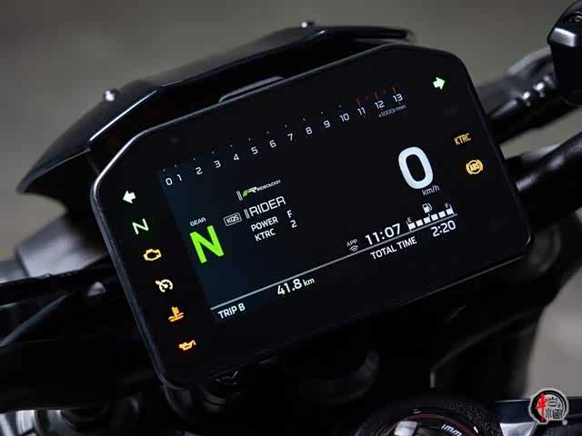 前灯组造型犀利,“猛禽凝视”的效果极具辨识度。车尾短促精干,全新设计的LED光导尾灯取代了老款的“Z”字形设计,更显时尚动感。配置是SE版本区别于普通版的核心。5英寸TFT全彩液晶仪表,支持川崎Rideology APP连接,可实现手机互联、导航、车辆状态监控、骑行数据记录等功能。电控核心是六轴IMU惯性单元,提供精准主动的安全保护。