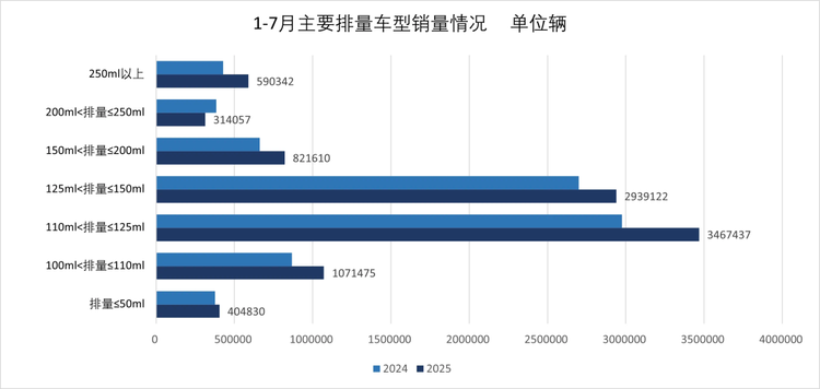 排量细分市场数据更能反映消费升级趋势。1-7月,250ml以上大排量摩托车销量达59.03万辆,较去年同期的42.81万辆增长37.89%;150ml-200ml排量区间销量82.16万辆,同比增长23.98%;100ml-110ml、110ml-125ml等小排量区间虽销量基数较大,但增速相对平缓。这一变化表明,消费者对摩托车动力性能、骑行体验要求不断提高,中大排量摩托车成为市场增长主要驱动力。