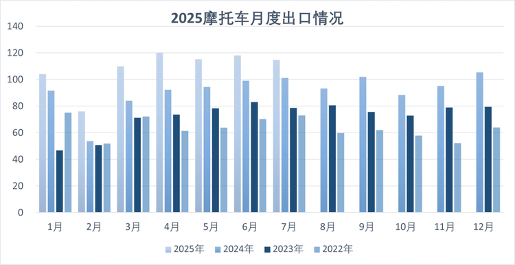 在全球贸易环境复杂多变的背景下,我国摩托车出口延续强劲增长态势,成为拉动行业增长的重要引擎。1-7月,摩托车生产企业产品出口总额达62.66亿美元,同比增长27.20%;整车出口量761.53万辆,同比增长23.52%,出口金额50.43亿美元,同比增长28.74%,出口量和出口金额均实现大幅增长。